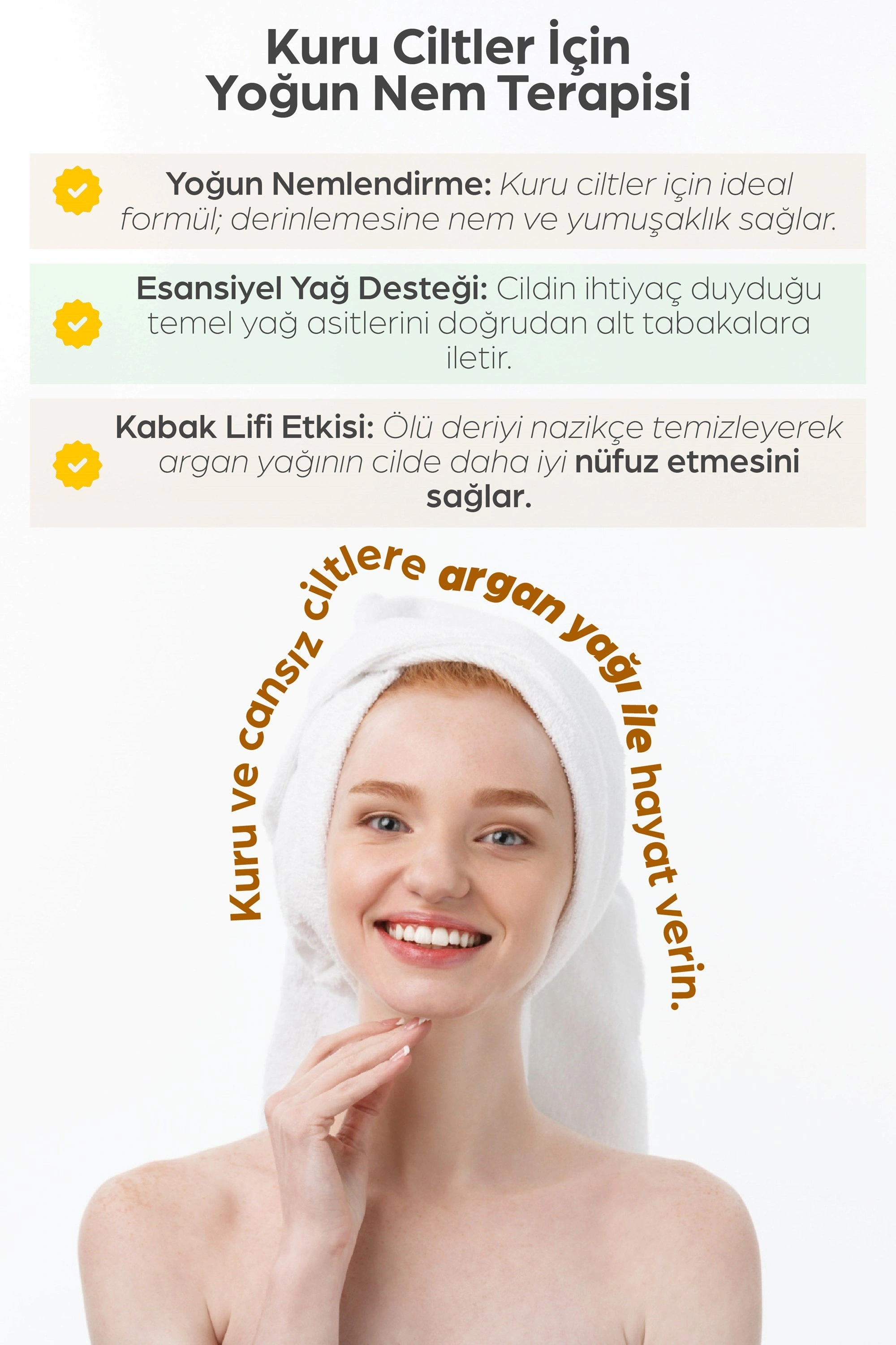 Argan yağı kuru cilt için idealdir, cildinizin kendini onarmasına yardımcı olacak birçok esansiyel yağ asitleri içerir ve aynı zamanda UV ışınlarına ve diğer faktörlere karşı cilt hücrelerini korumak için bir koruyucu tabaka oluşturur.